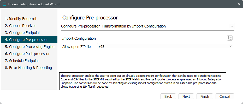 - On the Configure Pre-processor step, an existing import configuration can be used to transform Excel / CSV files into STEPXML, so that the processing engine can read those files.