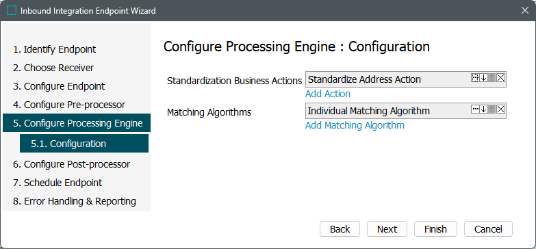 - On the Configure Processing Engine step, business actions can be configured to process the temporary STEP source objects in order to standardize the data, which allows for more accurate matching.
