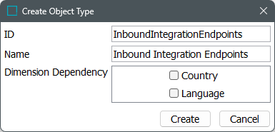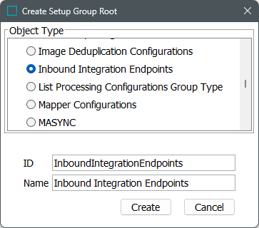 - In the Create Setup Group Root dialog, select the inbound integration endpoints object type, enter an ID and a Name, and click Create.
