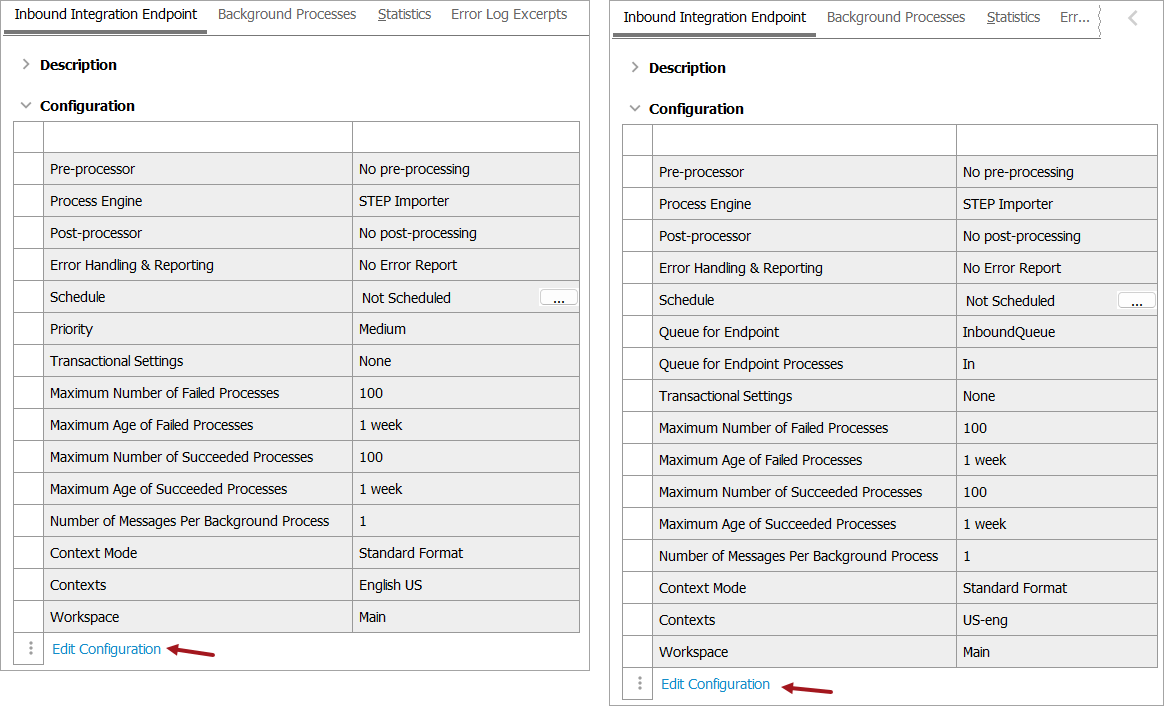 - For information on the Queue for endpoint (legacy), Queue for endpoint process (legacy), Transactional settings, Maximum number of waiting processes, Maximum number of old processes, Maximum age of old processes, Number of messages per background processes, Contexts, and Workspace parameters, refer to IIEP - Configure Endpoint.