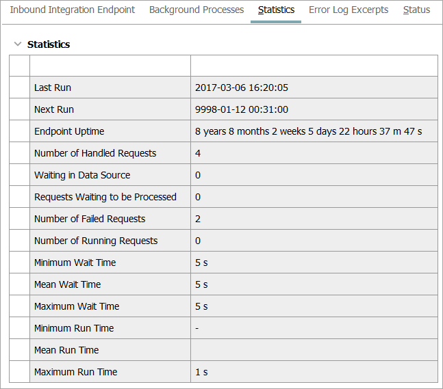 This tab provides statistics about the number of requests handled, run times, and wait times. Key measures are Endpoint up-time, Waiting in data source, Number of failed requests (Background Processes with errors), and Mean run time (average processing time per import). This data cannot be exported.