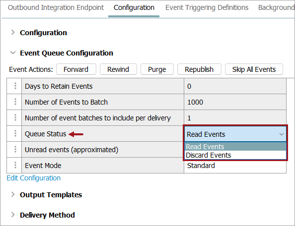 For event-based integration endpoint, the OIEP status (enabled / disabled) setting and the queue status (read events / discard events) setting are independent of each other, but work together to determine how data is processed.