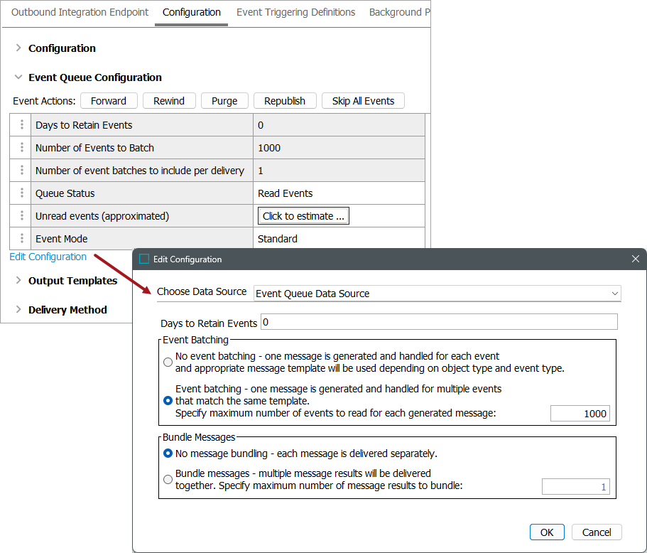 - For information on the 'Number of events to batch' and 'Number of event batches to include per delivery ' (which are controlled by the Event Batching and Bundle Messages parameters on the Edit Configuration dialog), refer to Event-Based OIEP Event Batching.