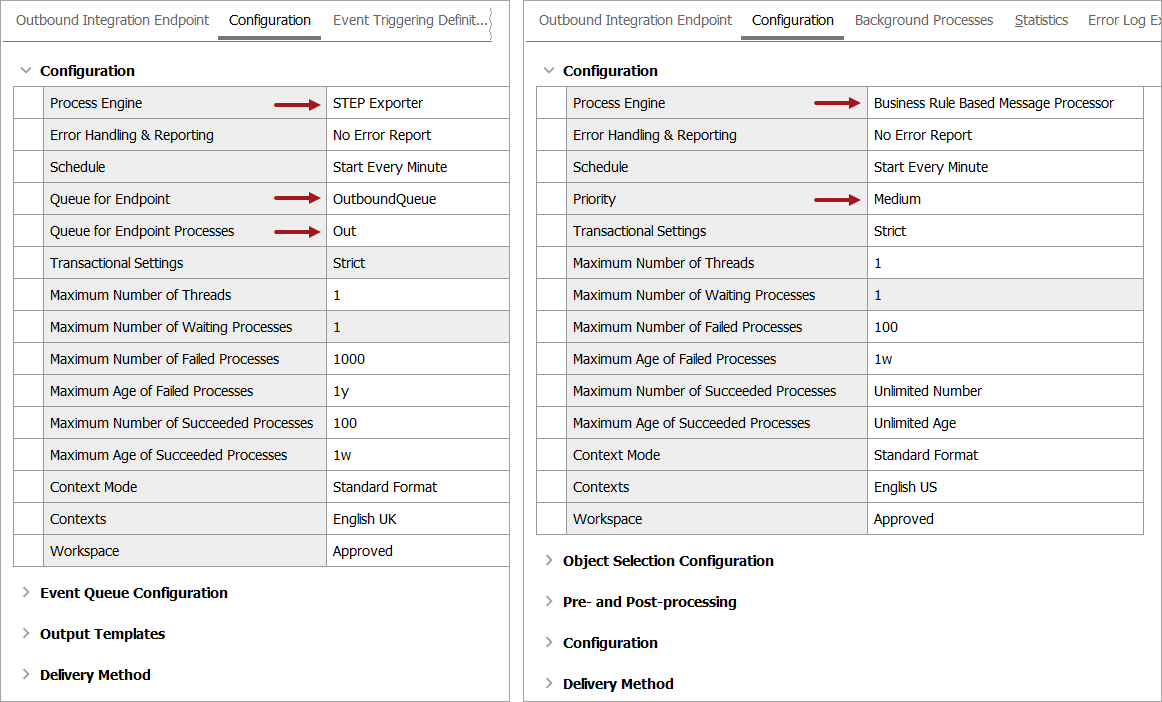 When the legacy multiple queues execution mechanism is implemented (BGP Legacy Multiple Queues) STEP allows you to define separate queues. 'Queue for endpoint processes' is the name for the queue that is used by the background processes started by the endpoint to handle the actual export. The queue is automatically created on the system if it does not already exist. High priority integrations or integrations with long-running processes should typically have their own queue, for example, including the ID in the queue name.