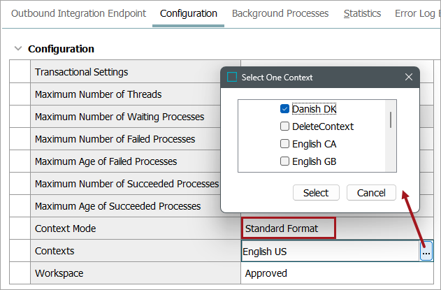 An explicit choice on whether the STEP Exporter should run in 'Standard Format' or 'Cross Context Format' mode is made when setting up the OIEP. It is possible to use cross context mode for endpoints with only a single context selected. This means that it will not be necessary to change downstream systems should more contexts be added later. For endpoints in 'Standard Format' mode (with just one context configured), it will not be possible to add more contexts without explicitly changing the export mode first.