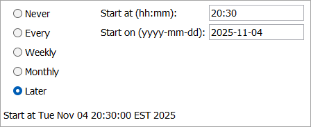 Later - automatically run the endpoint only once, at the time and date specified. The selections are summarized at the bottom of the dialog.