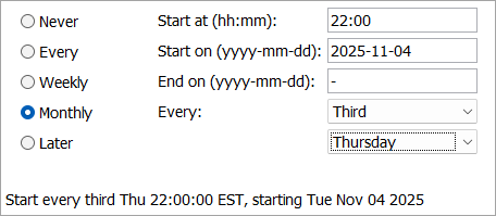 Monthly - automatically run the endpoint repeatedly, once a month, based on the selected time, start and end dates, week of the month, and day of the week. The 'Start at' parameter determines the time of day that the endpoint will run. The 'Start on' parameter determines the date the endpoint will first run, while the 'End on' parameter determines the date of the endpoint's final run. The 'Every' dropdown parameter selections for the week of the month and the day of the week determine when the endpoint will run. The selections are summarized at the bottom of the dialog.