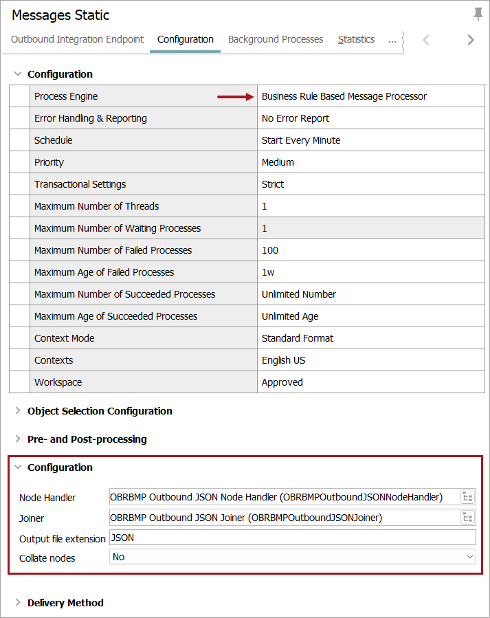 A second Configuration section is available when the Business Rule Based Message Processor is selected for an OIEP. For information on selecting a process engine, refer to the OIEP - Event Based - Configure Endpoint topic or the OIEP - Select Objects - Configure Endpoint topic.