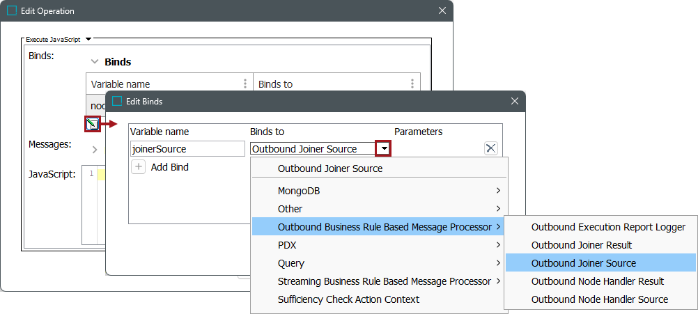 The OutboundBusinessProcessorJoinerSource interface (for JavaScript business actions, the interface is available via the Outbound Joiner Source bind option) provides the business action access to the messages.