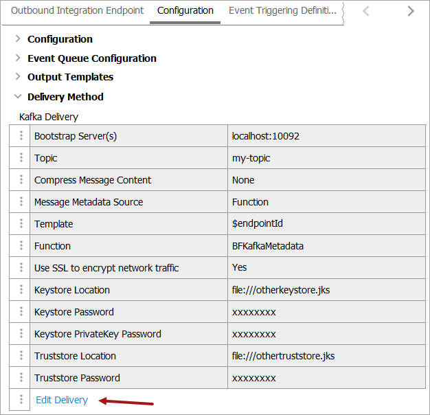 The Delivery Method section in an OIEP includes the same parameters for both Event-Based and Select Objects endpoints. The delivery method controls how the output is delivered to an external system.