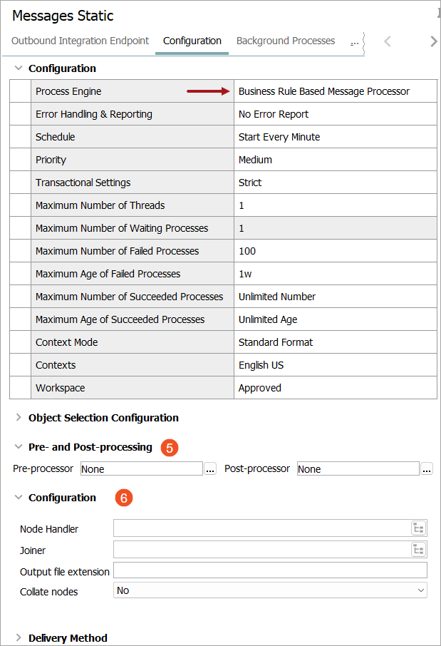 - In the OIEP editor, when using the Business Rule Based Message Processor process engine, specify the pre- or post-processors (if any) as described in OIEP - Event-Based - Pre- and Post-processing Section.
