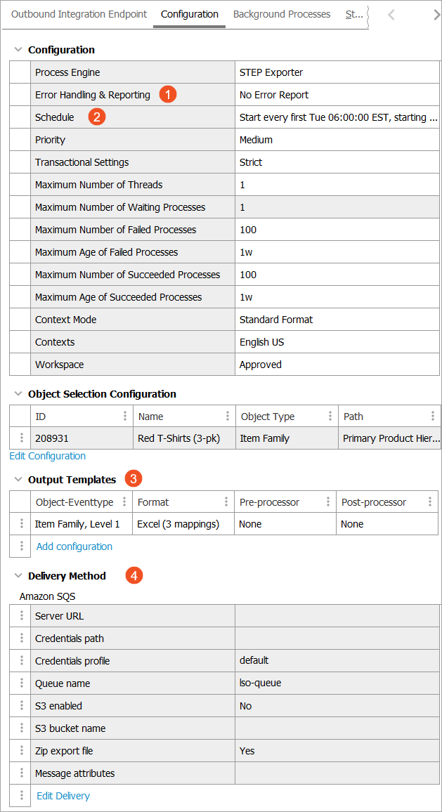 After completing the Outbound Integration Endpoint wizard, for a Select Objects OIEP using the STEP Exporter process engine, the OIEP editor includes additional parameters that must be set manually before the OIEP can run.
