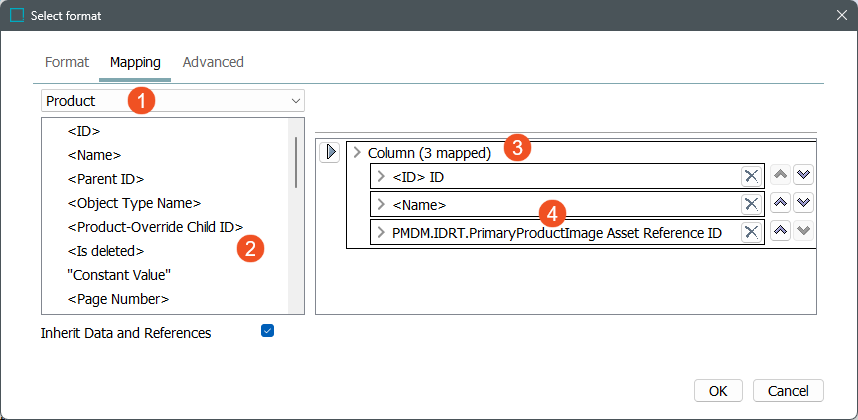 • In the Object Selection Configuration flipper, if a classification object is selected, and in the Output Templates section, the Format field has Asset selected in the Mapping tab (and relevant data sources are mapped), all assets below that classification object are exported.