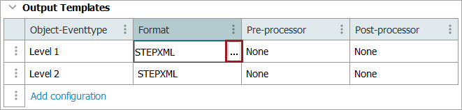 4. To edit existing Object-Eventtype settings, click into the desired field to display an ellipsis button (). Click the ellipsis button () to display the 'Conditions for output template' dialog discussed above.