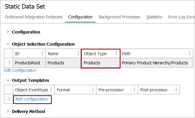 • Output templates encompassing all object types are only available if all object types are chosen when making the configuration. This prevents excess output from the endpoints.