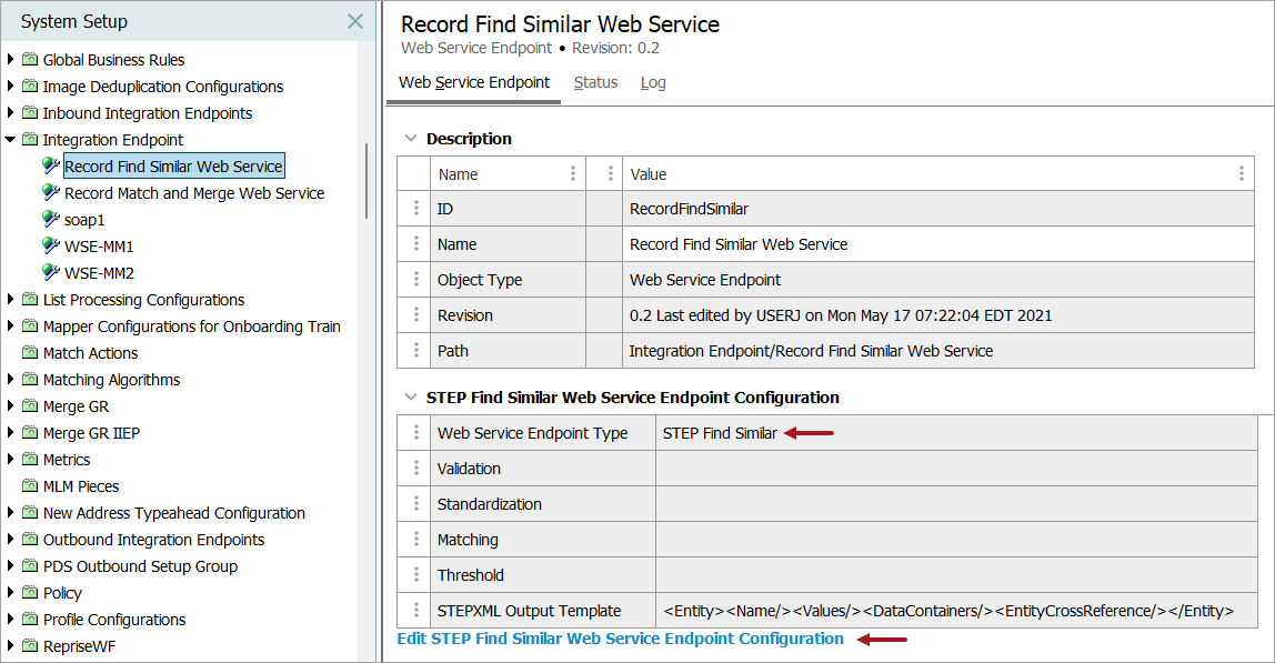 On the Web Service Endpoint object, open the STEP Find Similar Web Service Endpoint Configuration section and verify the 'Web Service Endpoint Type' is set to 'STEP Find Similar'. The type cannot be changed, if necessary, create a new web service endpoint. For other types of endpoints, refer to the configuration options defined in the Web Service Endpoints topic.