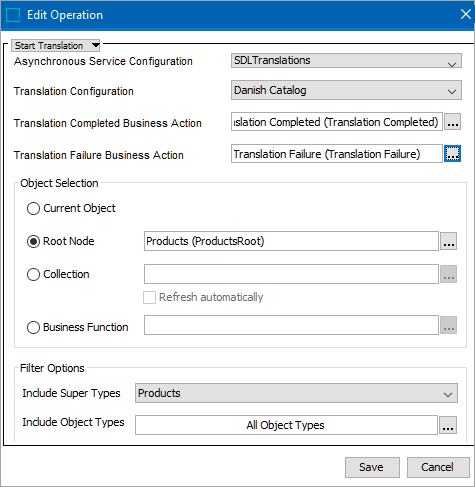 - Include Super Types - From the dropdown list, select which super types should be translated. This field is only activated if Root Node, Collection, or Business Function was chosen for Object Selection. The super type options are Products (default), Classifications, Assets, or All.