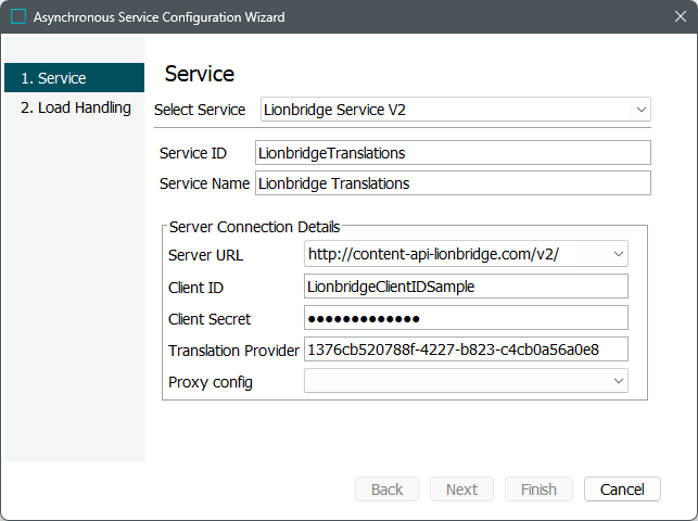 • Select Service - Select the Lionbridge Service V2 for Lionbridge translations