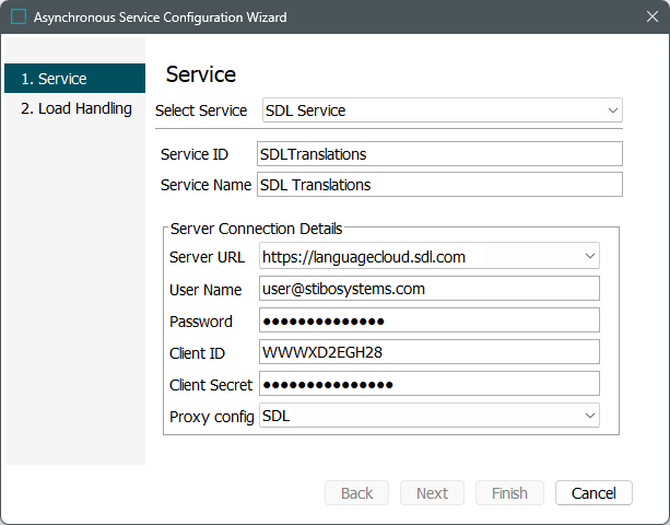 • For SDL translation service, most of the information in the Server Connection Details of the Service step is provided by SDL. Enter your own values for parameters as illustrated in the image below: