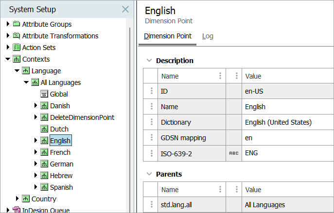 When sending files to be translated, some services require that the ISO-639 language code needs to be sent, followed by the ISO-3166 country code. For example, if a file was being translated from English US to Danish Denmark for SDL Translation, the required language codes would be 'en-US' and 'da-DK.' As shown below, the language dimension point IDs follow the required format, so a transformation lookup table is not required.