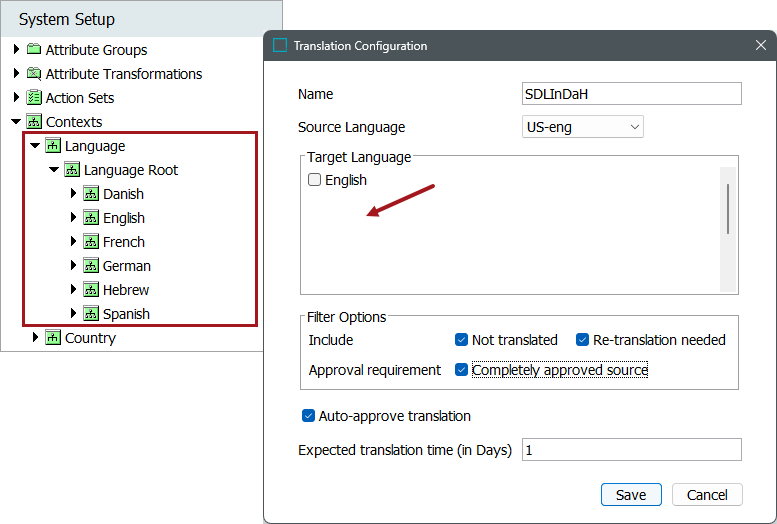 If the source and/or target translations are not displaying in the Translation Configuration dialog like in the image below, then the Language and Country fields on the Contexts editor need to be configured.