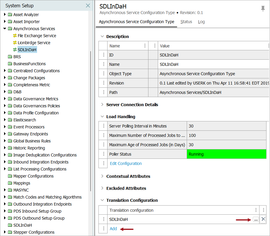 - In System Setup, select the asynchronous service configuration ('SDL Translations' is the example shown in the images below), and on the first tab open the Translation Configuration flipper.