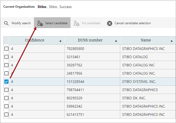 • On the D&B Match status selector, the user clicks the Select Candidate state.