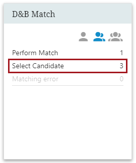 • If multiple candidates are returned from D&B, and none or more than two candidates exceed the Autolink Threshold configured on the 'D&B Match Config Sync (Identity Resolution)' (ID: DnBMatchOpConfigSync) operation configuration, the customer record moves to the D&B Match Candidates screen for a user to select a candidate. A user evaluates the D&B records based on designated criteria to make a best-match choice and selects one candidate D&B record to reference. The select candidate process is best completed in Web UI as described below.