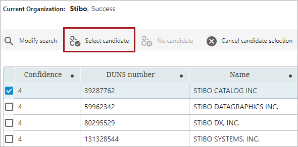 For organization entities that have multiple match candidates, a single candidate must be manually selected. The Web UI is recommended for this process. Detailed information for configuring and using the Web UI for D&B can be found in the D&B in Web UI topic.
