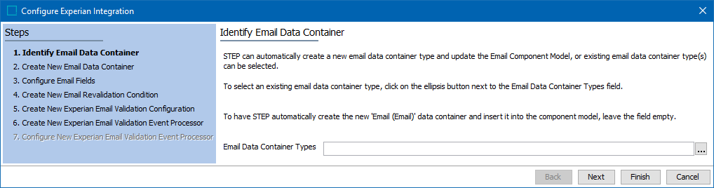 The Configure Experian Integration dialog displays the wizard step 'Identify Email Data Container' with detailed configuration instructions. Read the dialog text carefully to determine the necessary action.
