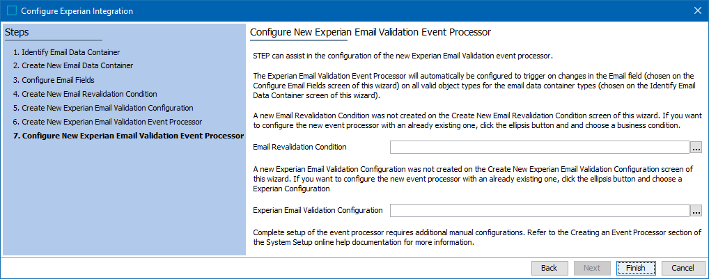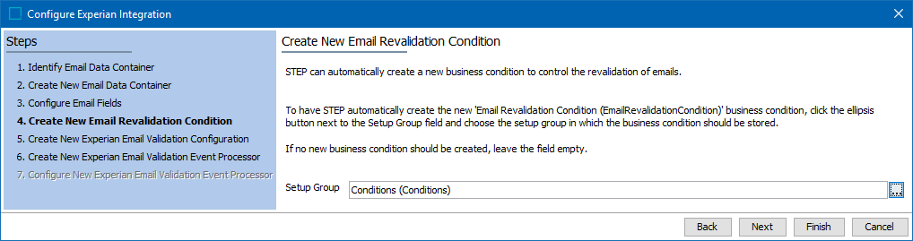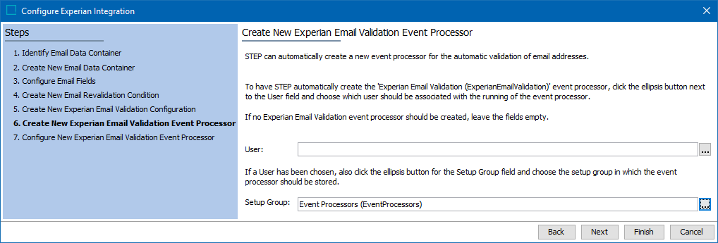 If a Setup Group was not selected during the wizard step 'Create New Email Revalidation Condition,' then the wizard step 'Configure New Experian Email Validation Event Processor' displays with the following.