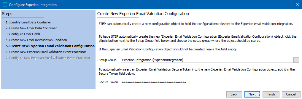 Secure Token: For security purposes, characters are masked as they are entered into the field. This field can be left blank, but you will need to return to this step again later to enter the token before the Experian email validation feature can be used.