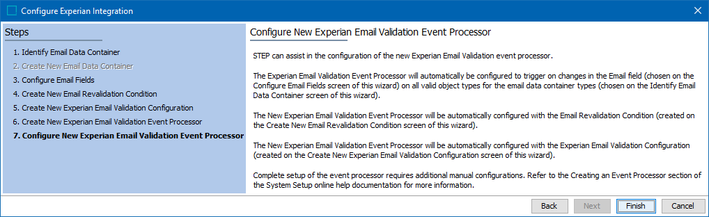 Click the Next button, and the wizard step 'Configure New Experian Email Validation Event Processor' displays with detailed configuration instructions.