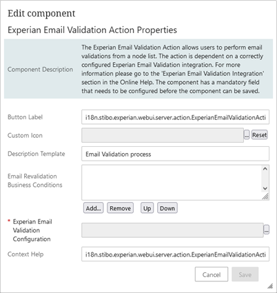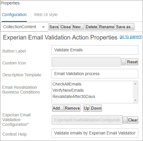 The Validate Email action button can be added to a collection or node list and configured with a previously created Experian Email Validation Configuration. Optionally, one or more email revalidation business conditions can be added, allowing users to refine the collection of emails selected to be sent for email validation.