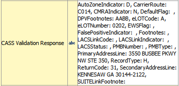 AutoZoneIndicator CarrierRoute CMRAIndicator DefaultFlag DPVFootnotes eLOTCode eLOTNumber EWSFlag FalsePositiveIndicator Footnotes LACSLinkCode LACSLinkIndicator LACSStatus PMBNumber PMBType PrimaryAddressLine RecordType ReturnCode SecondaryAddressLine SUITELinkFootnote |