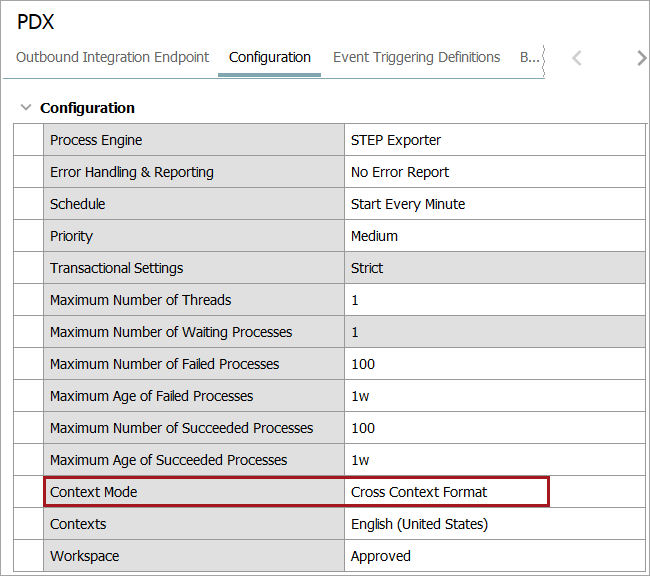 Context Mode: To ensure that the OIEP always sends cross context formatted Advanced STEPXML to PDX, set the 'Context Mode' to 'Cross Context Format' as highlighted below: