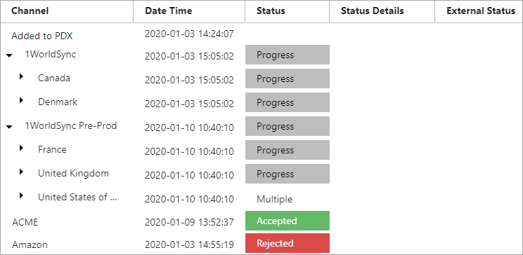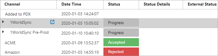 The image below shows an example of the status of a product that has been added to PDX and then submitted to both stand-alone channels (i.e., ACME and Amazon) and group channels (i.e., 1WorldSync and 1WorldSync Pre-Prod).