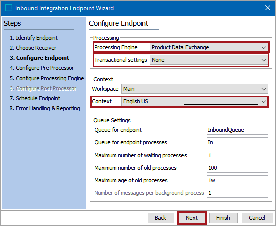 On the Inbound Integration Endpoint Wizard dialog, configure the 'Product Data Exchange' receiver option. For details, refer to the PDX Receiver topic in the Data Exchange documentation. Click the Next button.