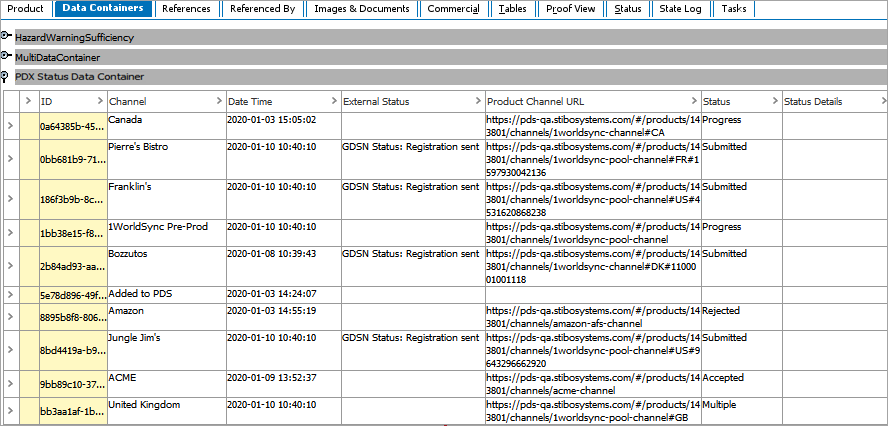 The example below displays a PDX Status Data Container in the workbench that includes pertinent channel names, date and times of product submission, status of products, the URL where the specific product is located, and any relevant status messages. The ID column contains the ID of the data container, which does not display in the Web UI PDX Channel Status component.