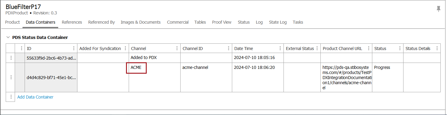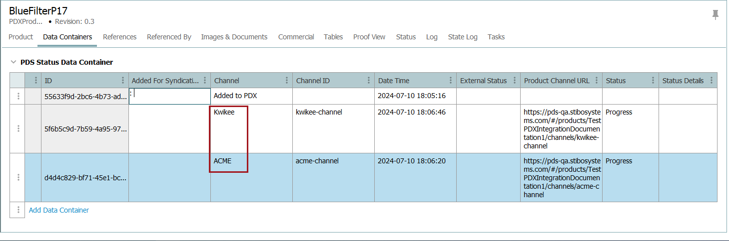 Rows are updated within the data container when a change of status is received from PDX via the PDX Inbound Integration Endpoint. Generally, these updates are due to a product being submitted to a channel within PDX or messages from channels, e.g., a submitted or rejected product message.