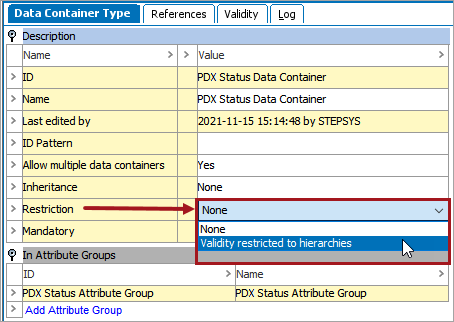 Optionally, restrict the data container to specified hierarchies. Select the 'Data Container Types' tab, click the 'Restriction' parameter and set it to 'Validity restricted to hierarchies.'