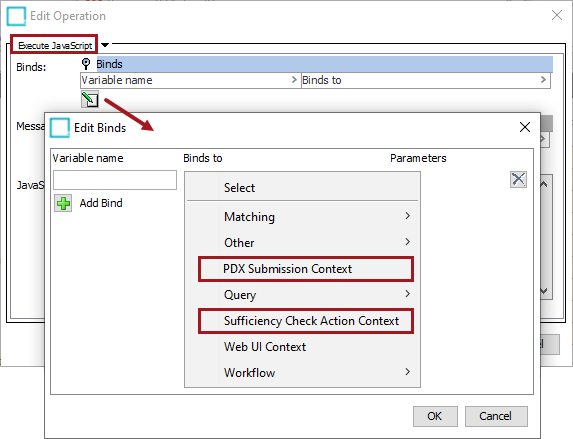 - Sufficiency Check Action Context - captures nodes, recipient mails, and channel ID data from the PDX Export Wizard for use in a business action. No additional parameter is required. For details, refer to the Sufficiency Check Action Context Bind topic in the Resource Materials online help documentation.