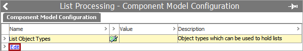 Click the 'Edit' button below the List Object Types entry on the component model to display the 'Edit Component Model Configuration' dialog.