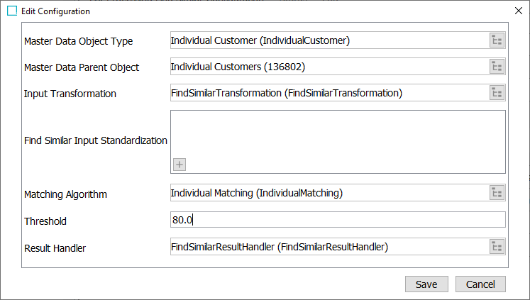 • Find Similar Input Standardization (optional) - select the business action(s) to normalize the master data (via the Find Similar Input Object bind ) before calling the find similar method on the matching algorithm. The Find Similar Input Object bind identifies the current object.