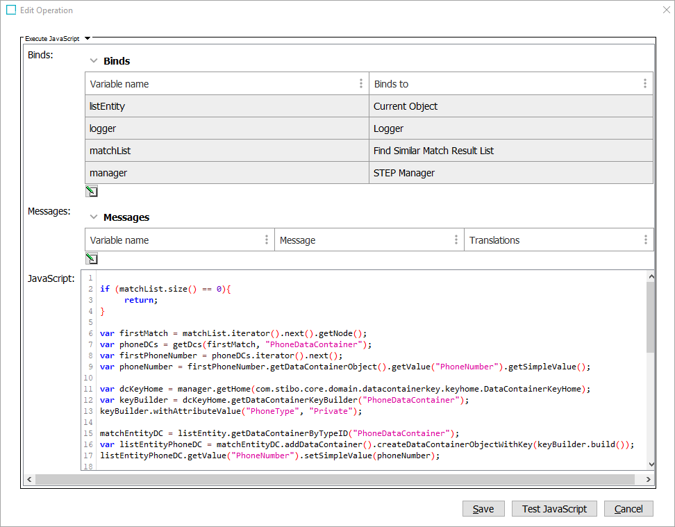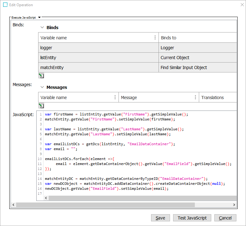 In the example below, the business action retrieves firstName, lastName, and email data container values from the listEntity object and transfers the values to the matchEntity object, which makes it possible to match the list record objects (the entity values) with the master data object (the entity values in the database).