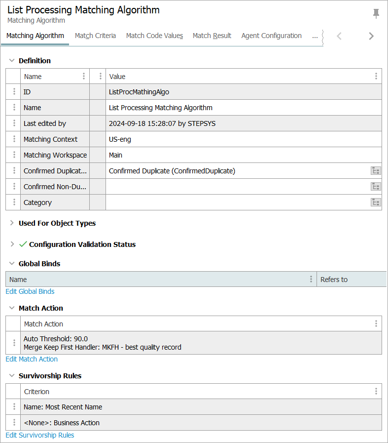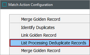 1. On the matching algorithm object, click the Edit Match Action link and select the 'List Processing Deduplicate Records' match action.