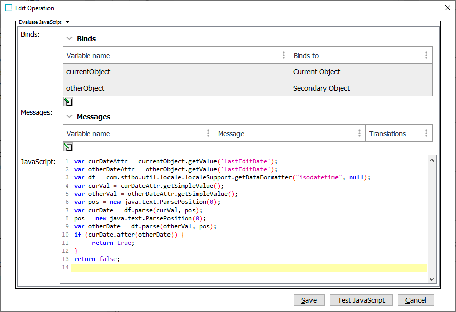 The following JavaScript binds may be used to configure a Merge Keep First Handler business condition.