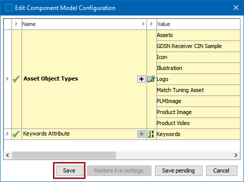 - The Save and Save pending buttons are activated. Click Save to remove the asset object type and close the Edit Component Model Configuration dialog. Click Save pending to keep the live configuration as-is and make additional changes later.