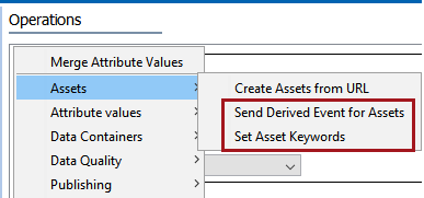 A category of bulk update operations named Assets is added to the system when the Asset Analyzer component is installed. The Assets category contains two operations for asset keywords: Send Derived Event for Assets and Set Asset Keywords. These are configured and behave in a near-identical fashion to the 'Send Asset Keywords Event' and 'Set Asset Keywords' business actions, which are explained in detail in the Configuring Asset Analyzer - Setup Group Items and Business Rules topic.