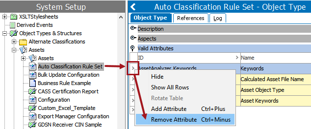 - Under the Valid Attributes flipper, right-click on the arrow in the row containing the AssetAnalyzer.Keywords attribute, then click Remove Attribute.